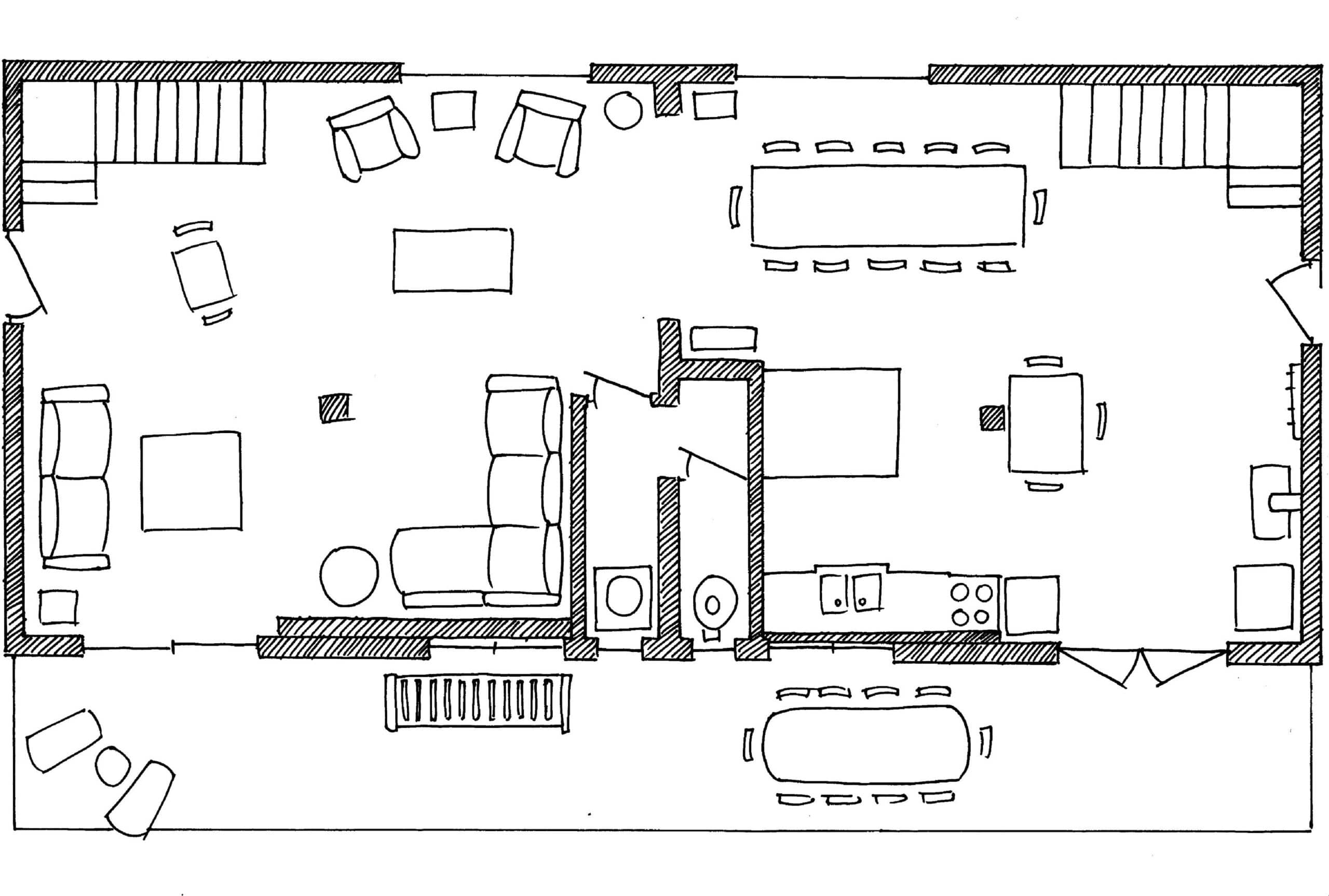 Het gelijkvloers is een volledig open ruimte, met aan het ene uiteinde de keuken en eetplaats en aan het andere uiteinde de living. In het midden is een bergruimte, een washok en een gastentoilet. Over de volledige breedte van de gîte is een overdekt terras dat uitgeeft op de private tuin.