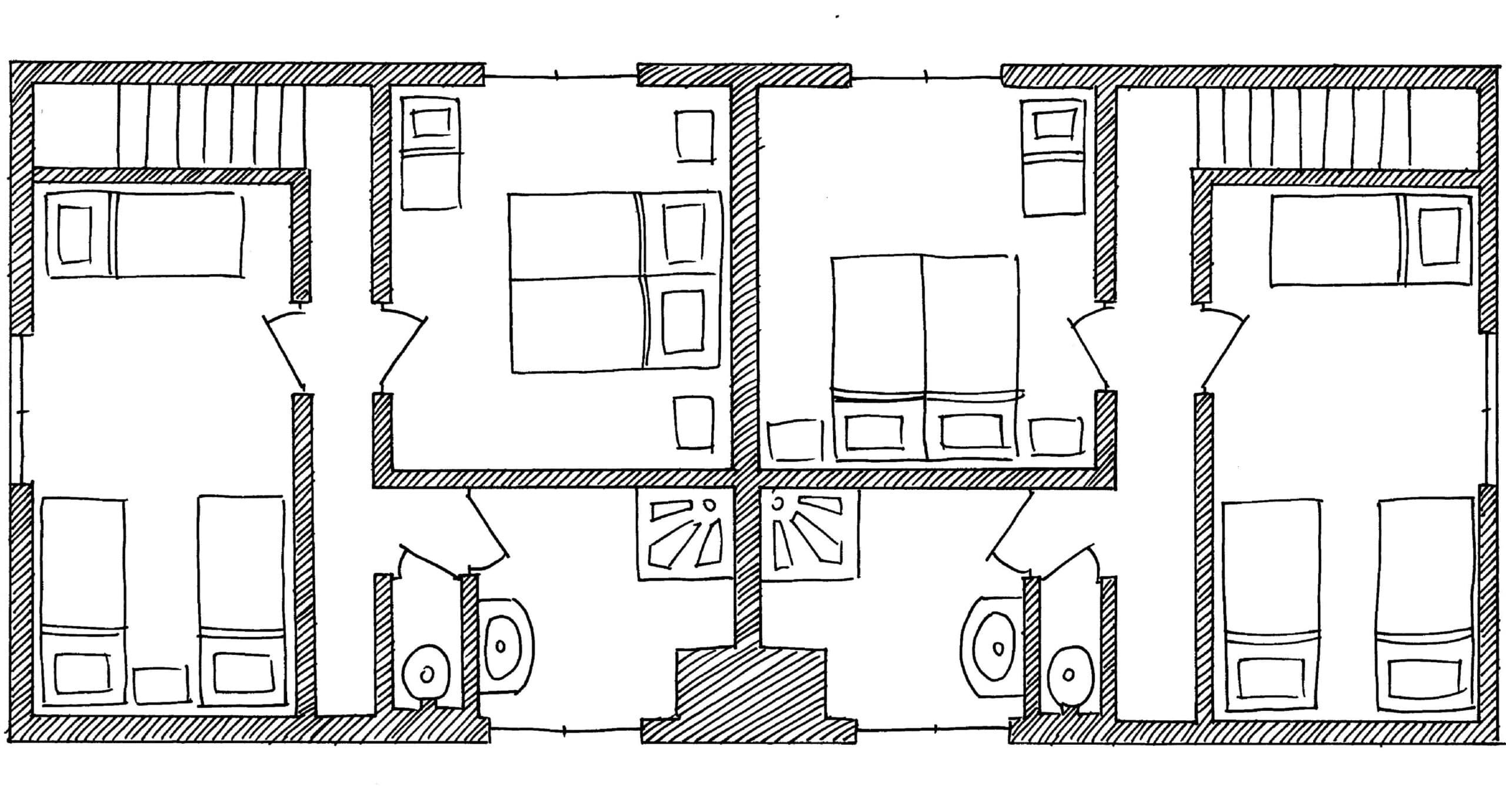 Het verdiep is opgesplitst in twee identieke zijdes met elk een eigen toegangstrap. Elke zijde beschikt over twee slaapkamers, een toilet en een badkamer met douche en wasmeubel.